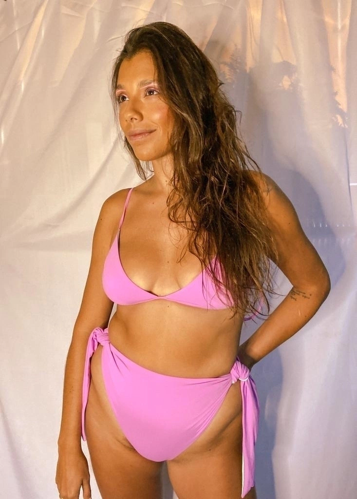 hotpants leblon dupla face, toda na cor lilás podendo ser usada com a amarração lilás ou na cor verde água.